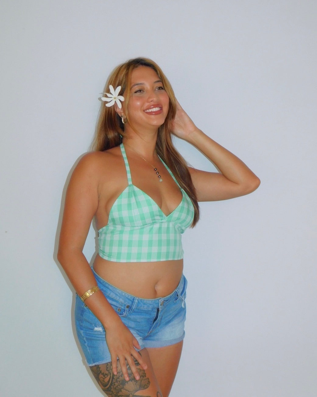 Details: Woven Cotton material. Tie-back detail for an adjustable fit. Provides adequate support for chest, with a flattering lift!